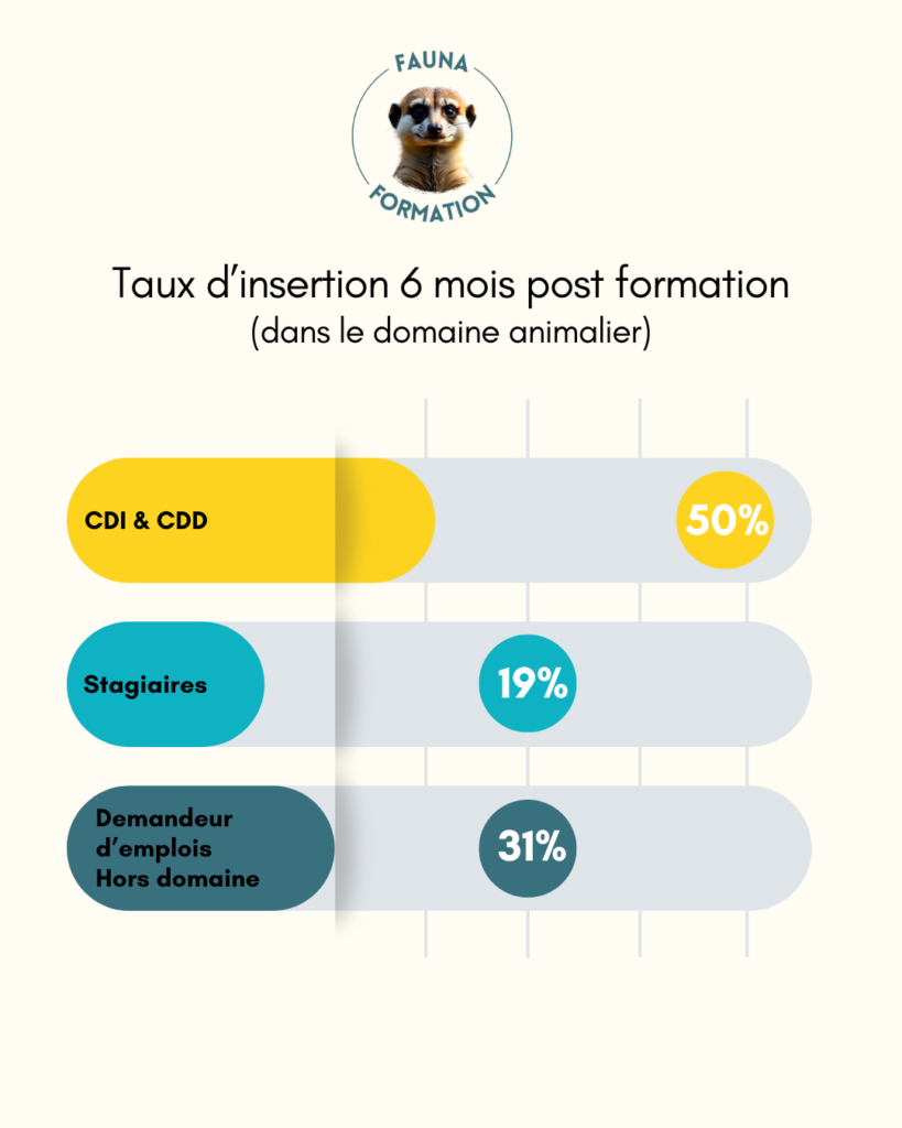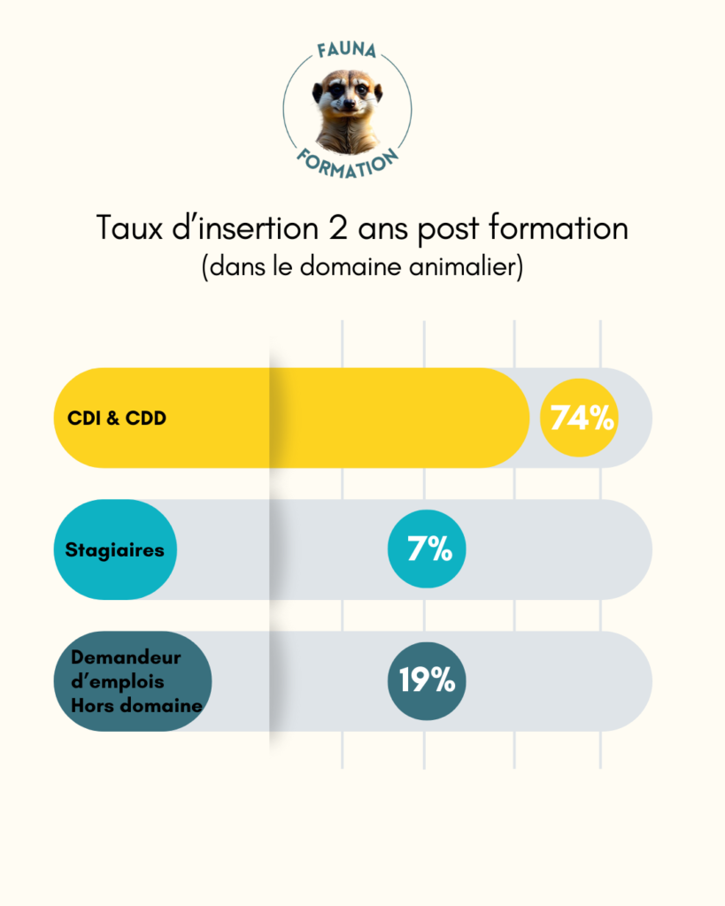 Chaque année, FAUNA Formation & Conseil mène une enquête auprès de ses anciens élèves 3 à 6 mois après la fin de la formation (questionnaire à froid) puis 1 à 3 ans après la fin de la formation (questionnaire de suivi des anciens élèves) afin de connaitre leur situation professionnelle. Les chiffres ci-dessous expriment le pourcentage d’anciens élèves en poste (CDI et CDD), en stage demandeur d’emploi ou ayant changé de domaine. Le sondage porte sur notre formation de soigneur animalier/entraineur.